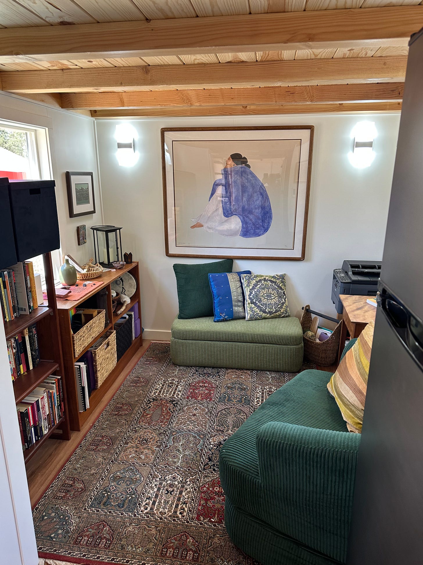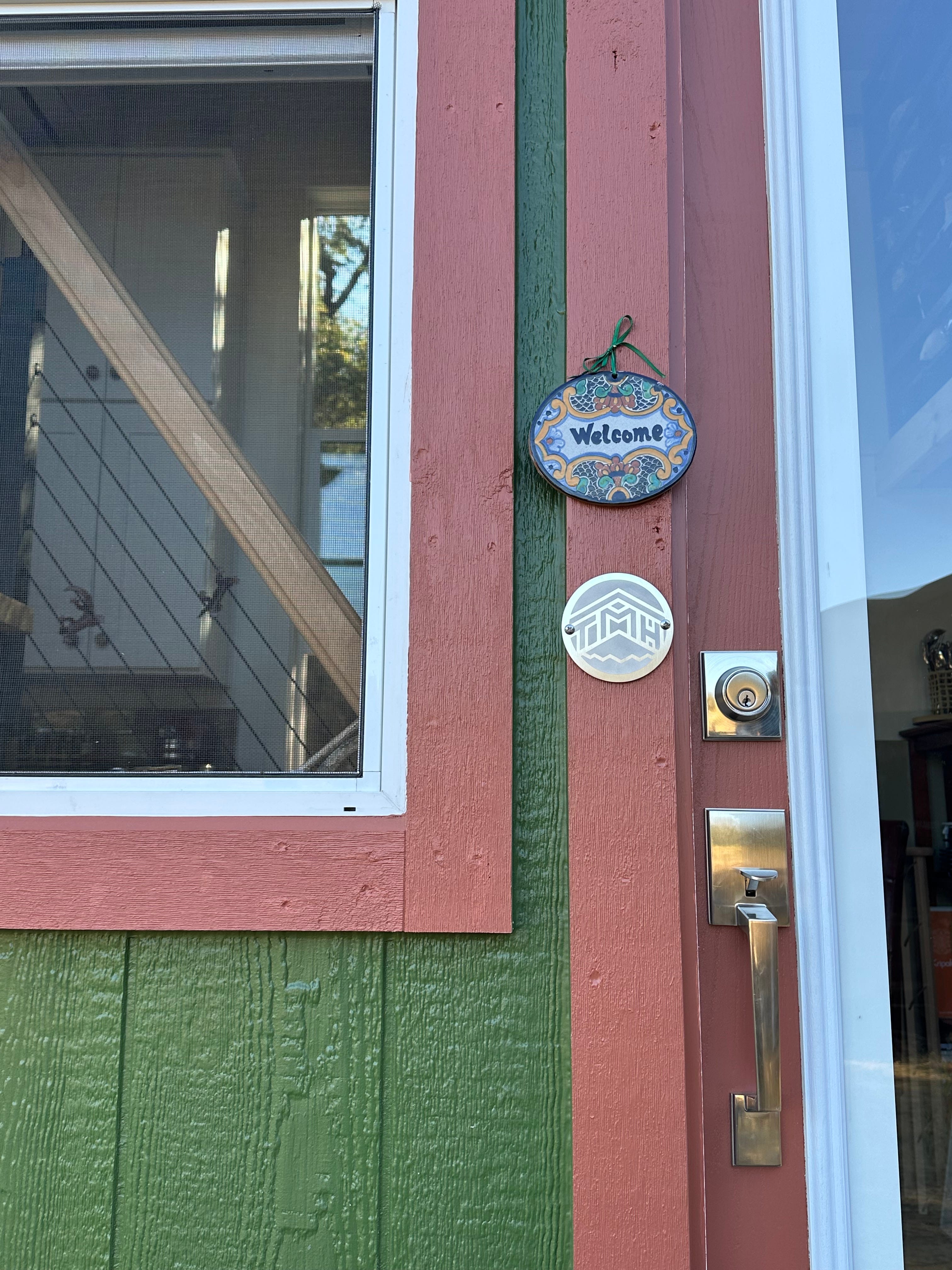 0:48 — Lou mentions that his builds usually come with an exterior metal accent wall, but that I chose not to have one. At the time, I was trying to be in compliance with the THOW (Tiny House on Wheels) guidelines recently approved by Nevada County, California. Here, as everywhere, regulations are evolving rapidly as advocacy groups push for a range of housing solutions both locally and nationwide. I committed to following the law as much as I could, adding extra D-rings for side-to-side stability, and eliminating the metal siding. My initial plan had the house in Inverness Green, the metal accent in Terra Cotta, and the trim in a Khaki-esque color whose name I’ve forgotten. I loved the palette, so when I dropped the accent wall, I kept the Terra Cotta for that color pop.